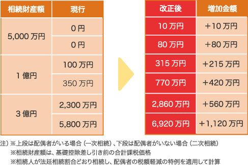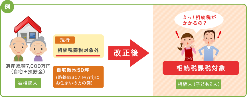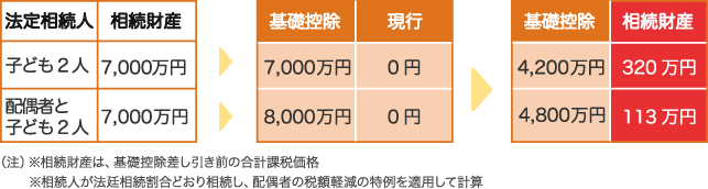 今までは相続税がかからなかった人でもかかるようになることがあります。 たとえば、相続人が配偶者と子ども2人の場合、今までは相続財産が8,000万円までは相続税がかかりませんでしたが、税制改正後は4,800万円より多ければ、税金を支払わなければならなくなるかもしれません。